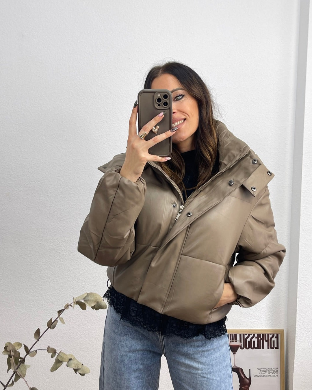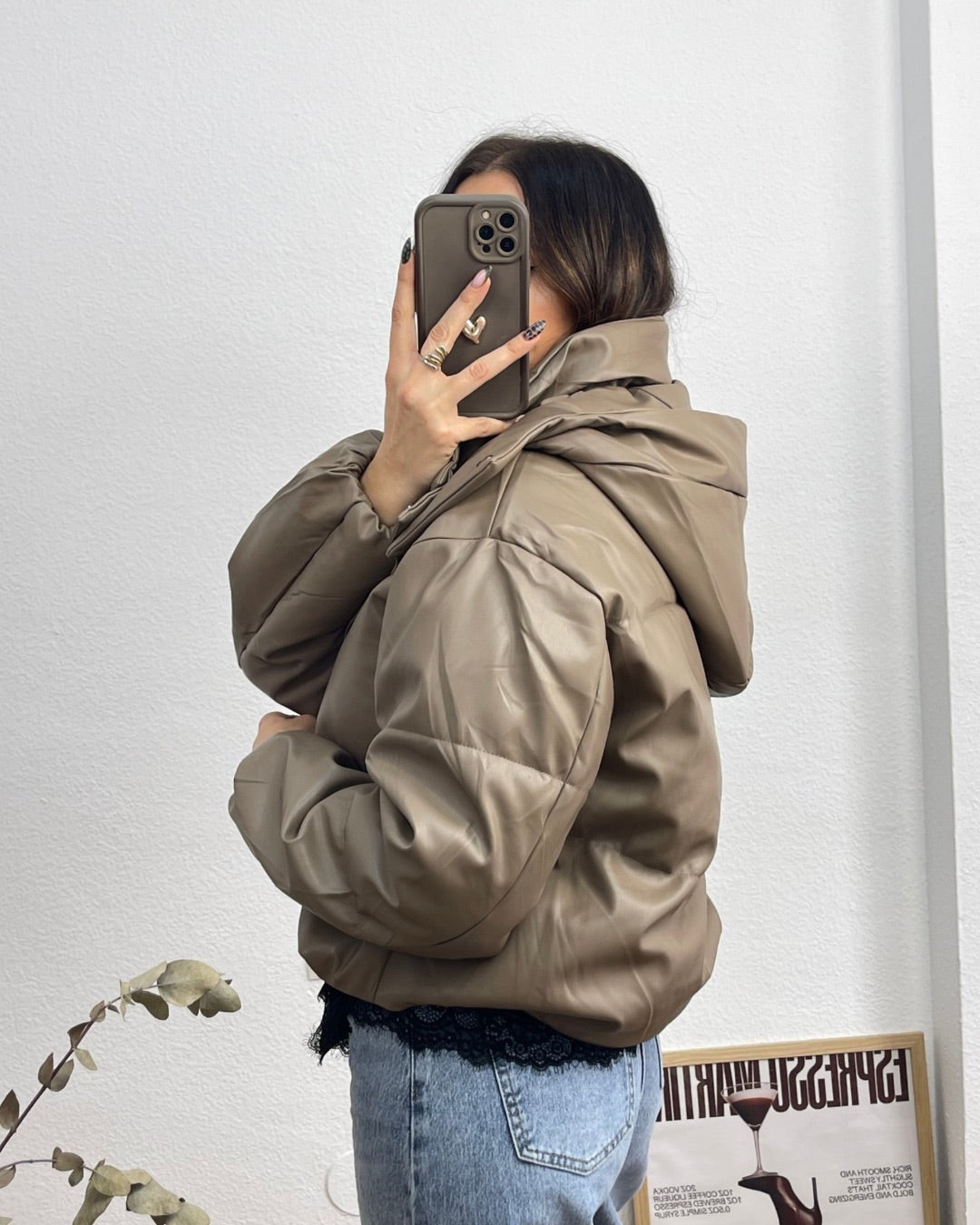 Abrigo de polipiel, con forro, cierre de cremallera y capucha.