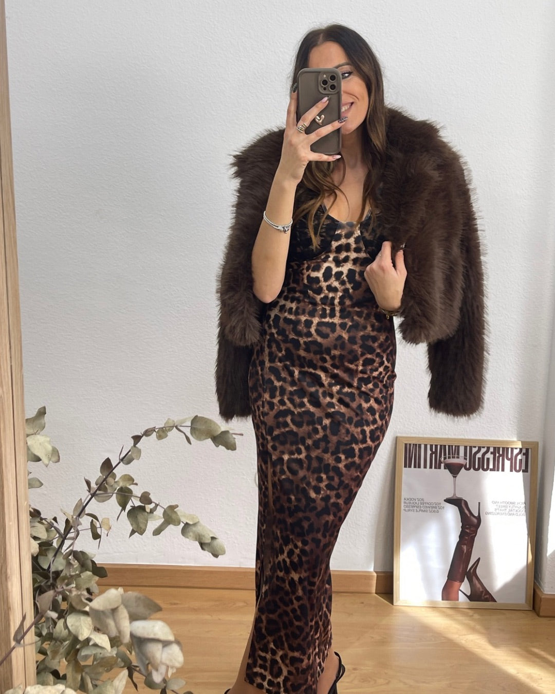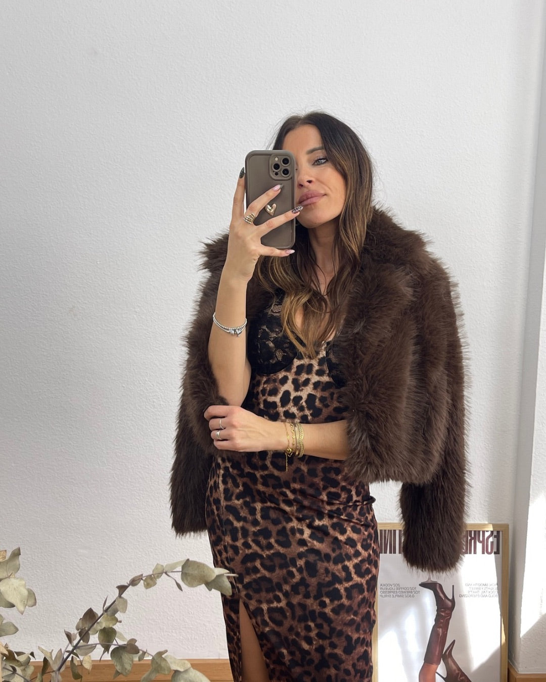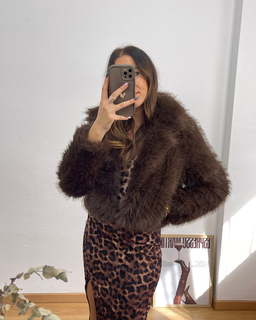 Es un abrigo de pelo, corte medio, con solapas y forro interior.
