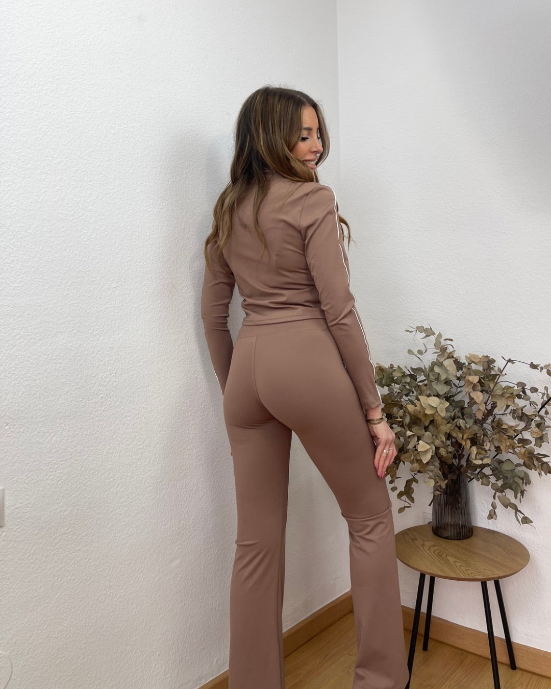 Conjunto deportivo de licra con lineas blancas moldeadoras. Pantalón de tiro alto y campana.
